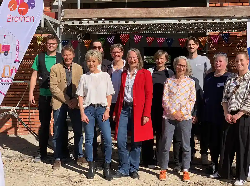 Richtfest des Kinder- und Familienzentrum Arbergen. Projektverantwortliche (v.l.n.r.): Bernd Lübbehüsen, Jonas Dorn, Jan Schulze, Kerstin Brockmüller, Petra Zschüntzsch, Sascha Aulepp, Anastasia Edelberg, Uta Kummer, Thomas Middendorf, Stephanie Bürding, Tanja Seekamp.