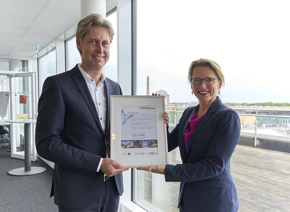 Thomas Börsch, IB-Geschäftsführer nimmt die Mitgliedsurkunde von Dr. Diana Wehlau, Abteilungsleiterin "Klima, Energiewende und Umweltinnovation" bei der Senatorin für Umwelt, Klima & Wissenschaft