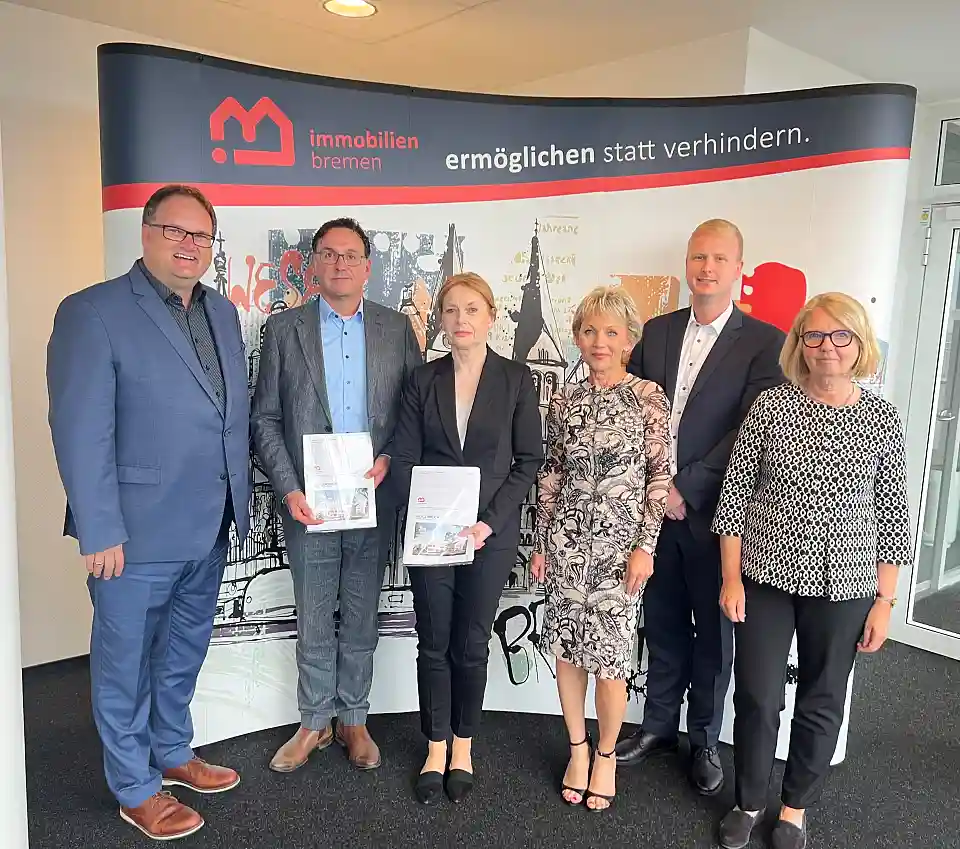 v.l.n.r.: Finanzsenator Björn Fecker; Carsten Hense (GF Goldbeck Public Partner GmbH); Susanne Kirchmann (GF Immobilien Bremen); Kerstin Brockmüller (Abteilungsleiterin Projektsteuerung bei IB); Tim Heinemann (PD – Berater der öffentlichen Hand GmbH) und Regine Dohle (GF Dohle+Lohse_Architekten).