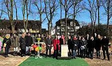 Am heutigen Mittwochvormittag (2. März 2022) fand bei strahlend blauem Himmel auf dem Gelände der Grundschule Fährer Flur die Grundsteinlegung des zukünftigen neuen Kinder- und Familienzentrums statt. Die Senatorin für Kinder und Bildung und Bauherrin, Sascha Aulepp, Vertreter:innen der späteren Nutzer:innen von KiTa-Bremen sowie Vertreter:innen von Immobilien Bremen, ADP Architekten, der Firma Viebag und weiterer am Bau beteiligten Akteur:innen nahmen an der Zeremonie auf der freien bisherigen Bolzplatzfläche zwischen den Bestandsgebäuden der Grundschule und der Turnhalle teil.